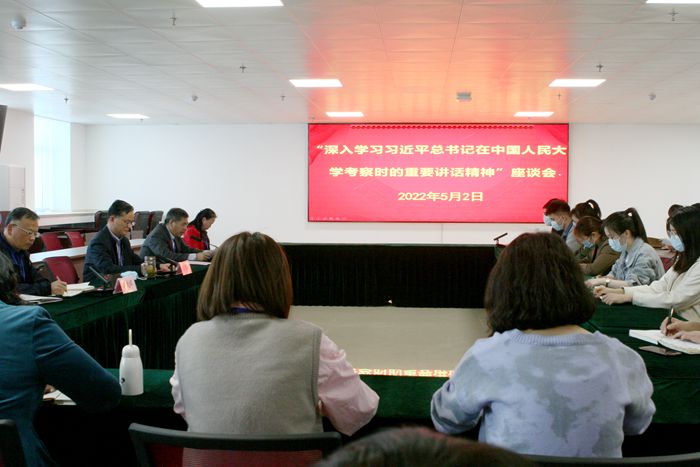 座谈会上,师生集体观看了习近平总书记在中国人民大学考察调研和重要讲话的视频。党委副书记韩光辉结合学院的思想政治教育工作,紧扣“理想信念、仁爱之心、科学思维”三个关键词进行了交流发言,学生代表和教师代表分别结合学习习近平总书记的重要讲话精神进行了学习交流。(办公室 王丹丽 审核 王建)