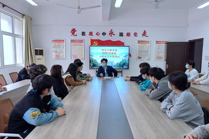 本网讯 为进一步做好大学生心理健康教育工作,增强心理育人针对性和实效性,夯实学院的“三全育人”工作,4月29日中午,信息工程学院在信息中心南306会议室召开班级心理委员工作会议,34名在校班级心理委员参加,会议由学院团委负责人、心理健康教育老师韦鹏程主持。