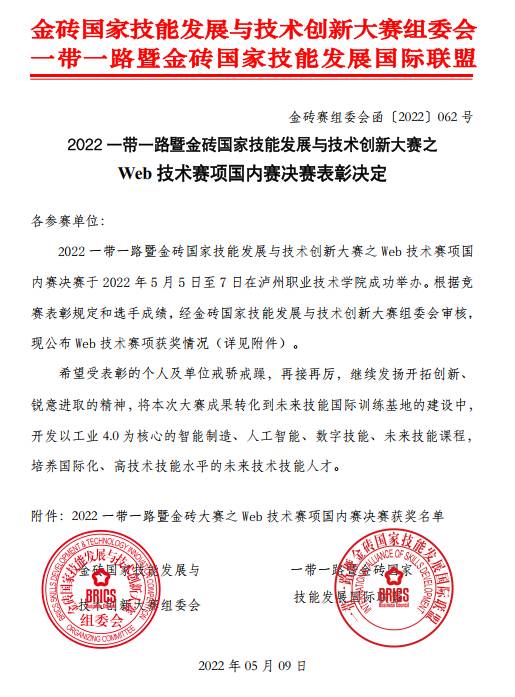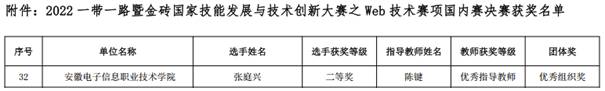 本网讯 近日,2022一带一路暨金砖国家技能发展与技术创新大赛官网公布获奖名单,我院计算机应用技术专业计用193班张庭兴同学在Web技术赛项中喜获二等奖,学校荣获优秀组织奖,并晋级由中华人民共和国教育部、中华人民共和国人力资源和社会保障部、金砖国家工商理事会、厦门市人民政府等主办的2022金砖国家职业技能大赛(启动赛)。
