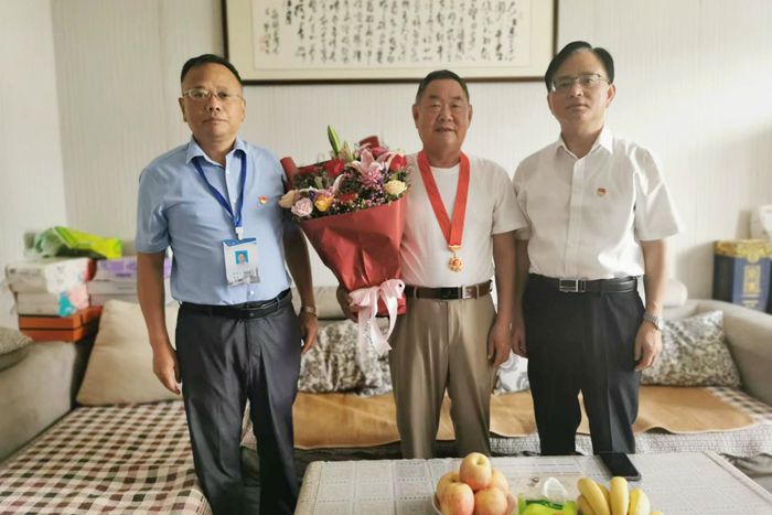 本网讯 为大力弘扬党的光荣传统和优良作风,6月30日,学院党委书记石象斌,党委副书记、纪委书记韩光辉到老党员邵廷付同志家中走访慰问,颁发“光荣在党50年”纪念章,党委委员、组织人事处处长聂小明参加活动。
