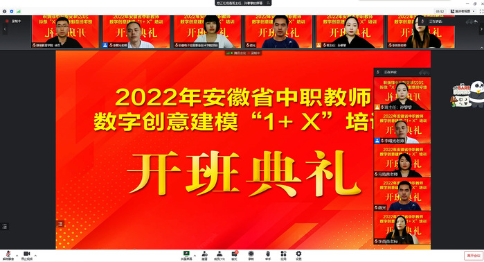 本网讯 2022年8月10日上午,安徽省2022年度中职教师素质提高计划省级培训项目——“数字创意建模“1+X””培训开班典礼通过腾讯会议在信息中心北306会议室隆重举行,来自全省16个地市的27名中职骨干教师怀着激动的心情相聚云端。