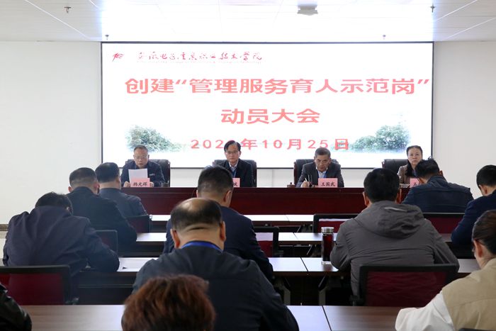 本网讯 为深化“三全育人”综合改革,进一步提升管理育人、服务育人工作水平,10月25日下午,学院召开创建“管理服务育人示范岗”动员大会,对示范岗创建工作进行动员部署,学院领导石象斌、韩光辉、马莉莉出席会议,会议由党委副书记、院长王国武主持,各部门负责人和示范岗创建人选参加会议。