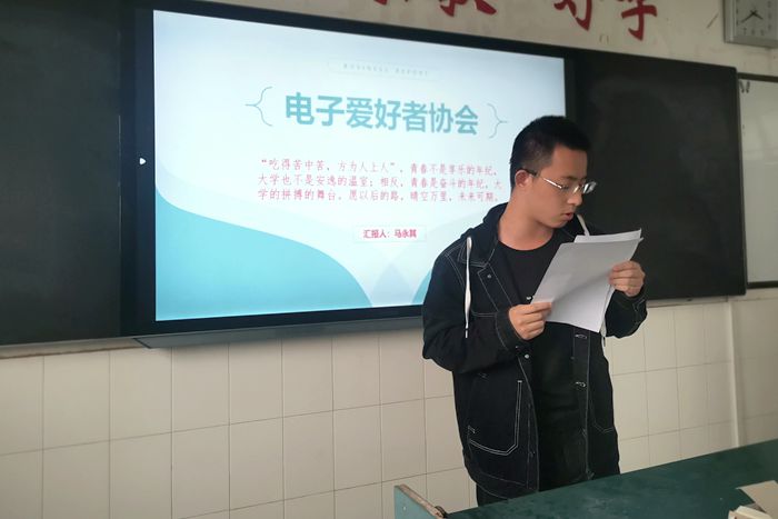 电信211班马永其会长代表电子爱好者协会发言,向与会新生介绍协会目前运行状况以及电子信息技术应用研发中心开放式学习平台、学习资源以及学习环境。