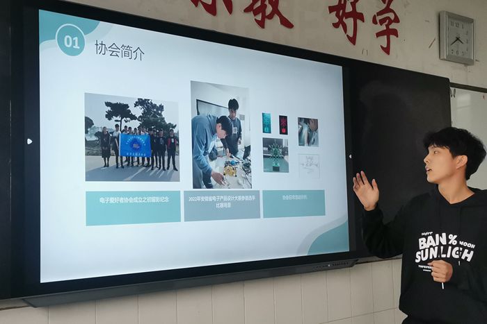 电信211班孙逍遥学长代表2021级参赛新生发言,重点围绕个人荣获2022年安徽省机器人大赛一等奖、参加安徽省电子设计竞赛经历,向与会新生分享个人学习方法和心得体会。