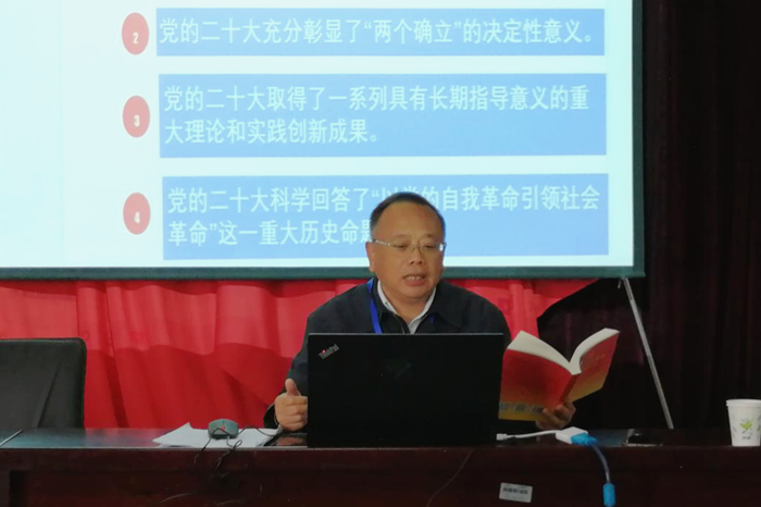 韩光辉从党的二十大的重大意义、党的二十大的主题、党的二十大的主要内容和学习贯彻落实党的二十大精神,致力于学院高质量发展四个方面,全面系统地宣讲了党的二十大精神。