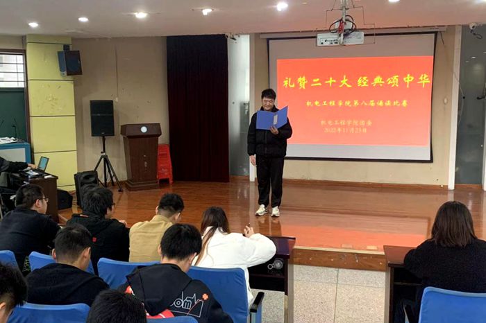 本网讯 为弘扬中华优秀传统文化,讴歌党的光辉历史和丰功伟绩,强化同学们“守初心、担使命”的思想自觉和行动自觉,增强爱党爱国情怀,11月23日下午,机电工程学院团委组织各班参赛选手在2002C教室举办“礼赞二十大 经典颂中华”经典诵读比赛复赛。