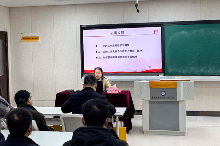 马莉莉指出,党的二十大报告中提出的教育、科技、人才是全面建设社会主义现代化国家的基础性、战略性支撑,首次把教育、科技、人才单列成章,进行三位一体的统筹部署,体现了党对教育的重视。她要求,广大党员干部和教师要牢记为党育人、为国育才的初心使命,牢固树立大职业教育观,立德树人、教书育人,卓越追求做新时代的“四有好老师”,做学生的“四个引路人”,把党的二十大精神融入工作实践,推动其进教材、进课堂、进头脑,以实际行动将党的二十大精神在学院落地生根。