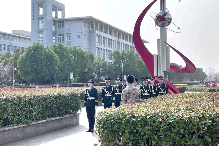 本网讯 为加强军民融合,推进军学合作交流,3月15日下午,保卫处、院团委邀请蚌埠装甲兵学院两名教官来我院对国旗队队员进行规范化训练。