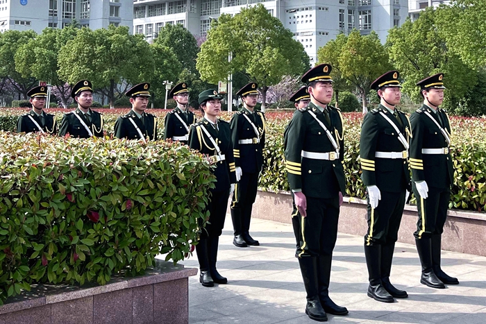 国旗队以护卫国旗为使命,以弘扬爱国主义精神为己任,以展现当代大学生团结进取、积极向上的精神风貌为目标,是校园文化的一面旗帜。在教官们细致的讲解、示范下,队员们的动作逐渐规范。教官们严格纠正同学的体态、站姿,每个细节容不得半点马虎。齐步走、站军姿、走正步,每个动作都经过反复的练习,国旗队队员们饱满的精神和标准的军姿成为校园的一道亮丽风景线。同时,教官还对学院安保公司人员进行了纪律教育和队列训练。
