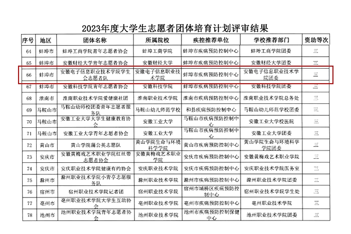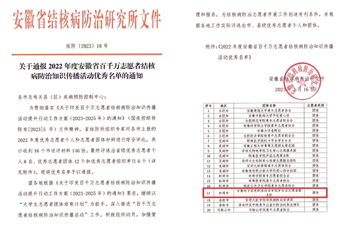 2022年,院学生会志愿者服务队因组织有力,荣获“2022年度安徽省百千万志愿者结核病防治知识传播活动优秀志愿者团体”荣誉称号,并获得2023年度“安徽省大学生志愿者团体培育计划”三等资助。