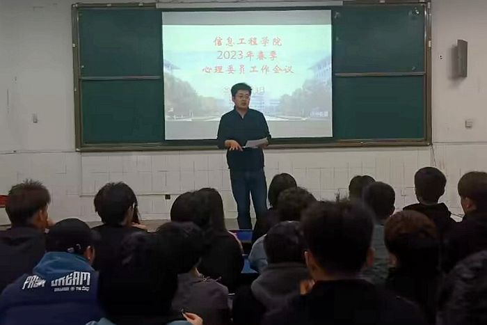 本网讯 为进一步增强心理委员的专业知识,压紧压实工作职责,提高其危机识别能力,增强心理育人的针对性和实效性,促进大学生心理健康教育工作有条不紊地开展,更好地夯实“三全育人”工作,4月3日晚,信息工程学院在1001C召开2023年春季学期心理委员工作会议,41名在校的班级心理委员参会,会议由学院团委负责人韦鹏程主持。