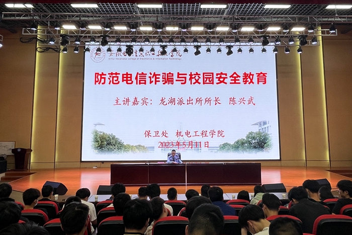 本网讯 为进一步落实上级和学院有关校园安全的工作要求,提高学生安全意识,树立正确的法制观念,增强对电信网络诈骗犯罪的辨别能力和应对能力,打造平安、和谐校园环境。5月11日晚,机电工程学院邀请龙湖派出所所长陈兴武在实验楼学术报告厅开展防范电信诈骗及校园安全教育。机电工程学院党总支书记、院长郝志廷,学院保卫处处长陈德峰参加活动。机电工程学院全体辅导员、600余名在校学生参与此次宣讲。活动由机电工程学院党总支副书记赵世同主持。