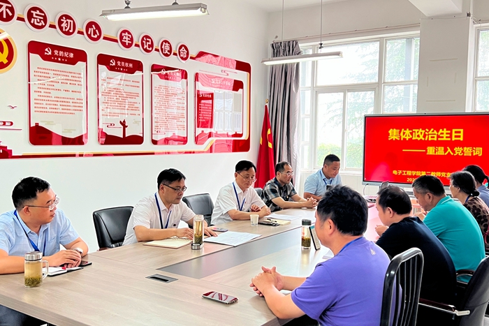 本网讯 6月25日下午,电子工程学院教师第二党支部为在6月份入党的石象斌、程伟两名同志过集体“政治生日”,通过送上祝福、追忆初心、分享感悟等方式,引导党员进一步淬炼党性修养、践行初心使命。电子工程学院教师第二党支部全体党员参加活动。