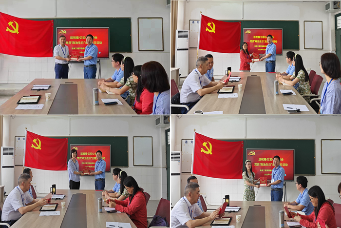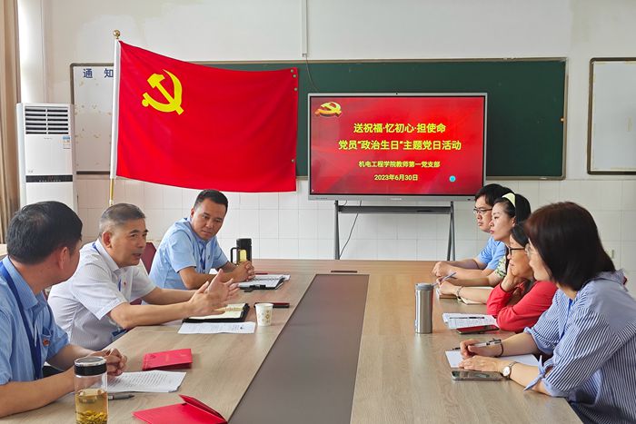 本网讯 6月30日上午,机电工程学院教师第一党支部以“送祝福·忆初心·担使命”为主题开展党日活动,为王国武、余华奇、路月潭、刘馨悦四名同志过集体“政治生日”。