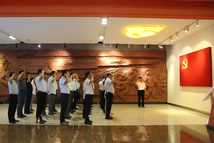 随后,党员干部来到兰考县展览馆焦裕禄事迹展厅,认真聆听工作人员讲解,深入学习习近平总书记关于焦裕禄精神的重要论述,重温焦裕禄早期生活困难、如何走上革命道路、如何带领兰考人民创造不朽伟业的感人事迹。一幅幅图片、一件件实物、一个个故事,生动再现了焦裕禄在兰考临危受命、执政为民、勇斗“三害”、改天换地的动人场景,使大家真切地感受到“亲民爱民、艰苦奋斗、科学求实、迎难而上、无私奉献”的焦裕禄精神。特别是走到焦裕禄生前坐过的破洞藤椅前时,全体党员干部无不动容:藤椅右侧的大窟窿正是焦裕禄艰苦奋斗、迎难而上、一心为民、无私奉献的生动见证。参观结束后,在党委书记石象斌带领下,全体党员面向党旗庄严宣誓,重温入党誓词。
