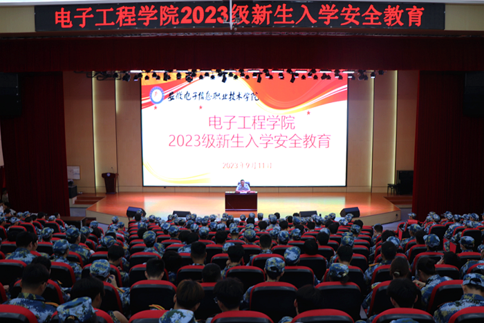 本网讯 为帮助2023级新生牢固树立安全意识,掌握安全防范技能,提升自我保护能力,以良好的状态迎接新学期、开启新征程。9月11日下午,电子工程学院在实验楼学术报告厅开展了“安全教育第一课”专题安全教育活动,蚌埠市龙湖派出所所长陈兴武受邀作安全教育讲座,电子工程学院全体2023级新生参加了本次活动。