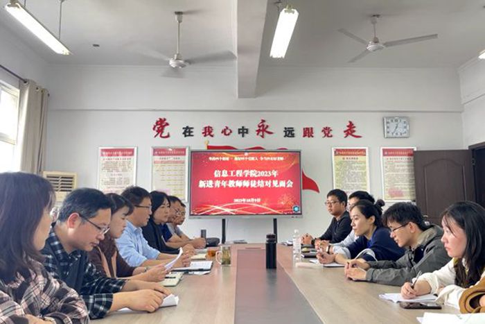 本网讯 为帮助青年教师提高教学业务水平、服务育人意识和学术科研水平,锤炼青年教师“爱岗、敬业、奉献”精神,促进青年教师尽快成长,站好讲台、站稳讲台,同时增进青年教师的荣誉感和使命感,使新入职的青年教师尽快适应新角色,融入学院大家庭。10月9日中午,信息工程学院在信息中心南306会议室召开新进青年教师师徒结对见面会,党总支书记、院长朱正月,党总支副书记张曌,副院长胡北辰,指导教师及七位2023年新进青年教师参会,会议由胡北辰主持。