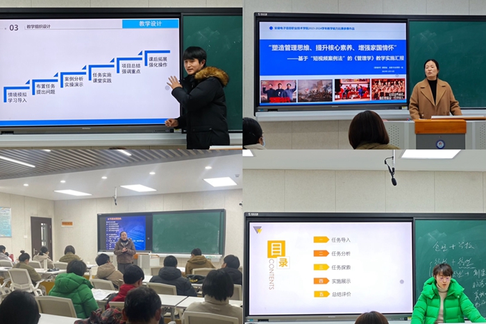 本次大赛对接安徽省高等职业院校教师教学能力大赛,竞赛环节分为教学实施报告介绍、无学生教学展示、现场评委提问三个部分。参赛教师团队准备充分,实施报告内容完整,聚焦一个项目、一个案例者或一个问题展开现场课堂教学。评委们就职业教育宏观政策、教育教学理念、教育教学方法,以及涉及参赛课程相关的教学理念、策略、模式、目标、成效、创新点等内容,进行现场提问。各参赛教师妙语如珠,教学思路清晰,教学过程设计合理,语言表达精炼,赢得现场观摩教师们阵阵掌声。经过激烈角逐,《管理学》课程团队获得总分第一的好成绩。
