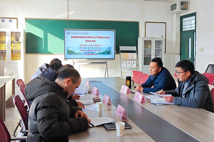 本网讯 为深入学习贯彻党的二十大精神,加快形成产教良性互动、校企优势互补的产教深度融合发展格局,推进全国新型玻璃制造装备行业产教融合共同体(以下简称“共同体”)建设,12月21日,机电工程学院联合蚌埠凯盛工程技术有限公司、安徽科技学院在4401会议室召开共同体建设交流会。蚌埠凯盛工程技术有限公司副总工程师兼企业技术中心主任王松、副主任段凤江,安徽科技学院机械工程学院院长李同杰、副院长乔印虎,机电工程学院院长郝志廷、副院长乔志杰分别代表三家牵头单位共商共同体建设。