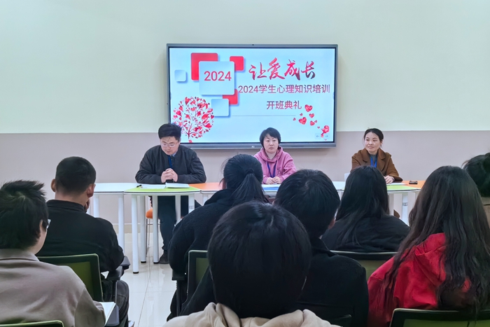 本网讯 为加强学院朋辈心理服务队伍建设,近日,“让爱成长 2024年学生心理知识培训”在大学生素质拓展中心举行。学生处副处长姚琦郡、心理健康教育中心主任崔敏、心理健康教育中心专职教师及2023级心理委员、心理信息员代表参加开班仪式。开班典礼由心理健康教育中心韦鹏程老师主持。