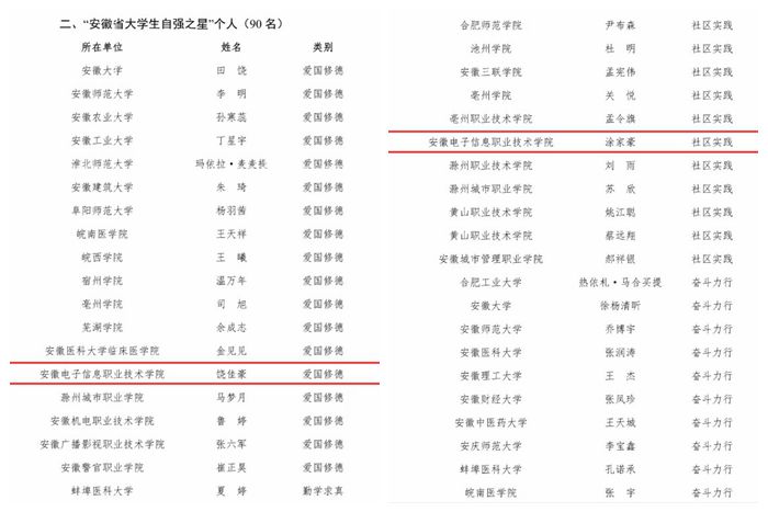 本网讯 近日,由团省委、省学联组织开展的2023—2024年度“安徽省大学生自强之星”评选结果揭晓,我院机电工程学院学生饶佳豪(爱国修德类)、电子工程学院学生涂家豪(社区实践类)获评2023—2024年度“安徽省大学生自强之星”荣誉称号,这也是学院学子连续三年获此殊荣。