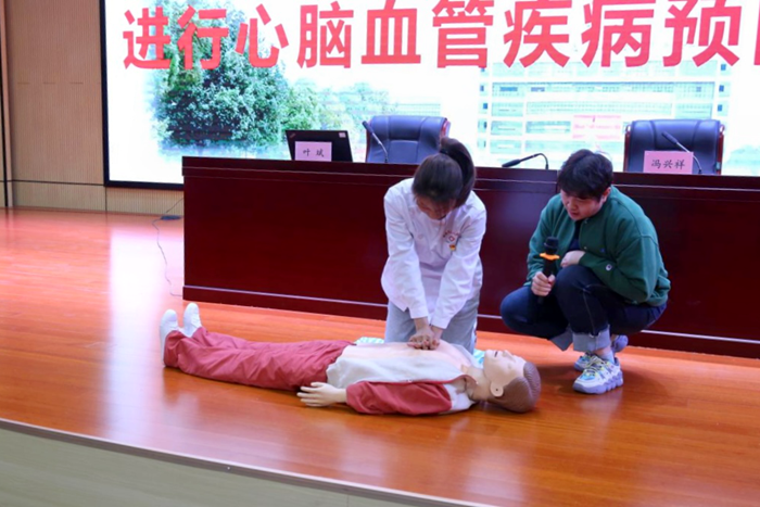 健康宣讲结束后,神经内科主管护师胡桂平为师生讲解心跳骤停的急救知识,同时演示心肺复苏全过程,即“判断患者有无意识、呼救、胸外心脏按压、开放气道及人工呼吸”的规范操作,介绍心脏急救全面参与,以及熟练掌握心肺复苏技能的重要性。