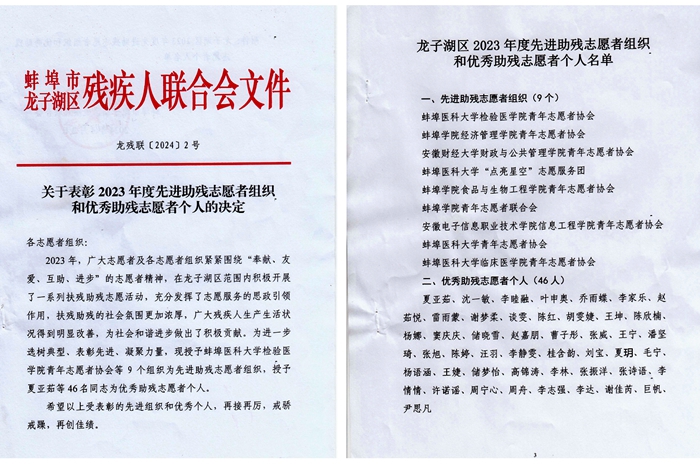 本网讯 近日,从蚌埠市龙子湖区残联传来好消息,信息工程学院青年志愿者协会被授予2023年度“先进助残志愿者组织”荣誉称号,计用2194班学生张振洋、计用2294班学生张诗语被授予2023年度“优秀助残志愿者个人”荣誉称号。