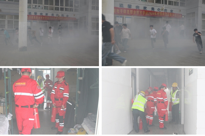 随着李素文发出的口令,顿时,在学生公寓3#—4#号哨声四起,消防警报响彻整个宿舍区,楼道及宿舍大厅内硝烟腾起。学生公寓出现“火情”,同学们立即按照安全指示灯指引方向撤离!公寓管理员一边吹哨报警,一边切断电源,熟练的取出灭火器,赶往火情发生地,实施灭火。巡查的安保人员接到报警通知后,即刻赶往火情发生地,从设置在公寓大厅内的微型消防站取出装备,迅速穿戴到位,开展灭火行动。住宿在3#、4#学生公寓中的学生,在消防志愿者和老师的疏导下,用湿毛巾捂住鼻子,弯下腰,按照消防“安全出口”灯指示方向,低身跑往消防通道和安全出口有序疏散。整个疏散过程中,全体学生反应敏捷、行动迅速规范、撤离井然有序。根据演练方案,参加演练的学生全部安全疏散到西侧足球场开阔地带,然后由参加演练的两个学院的带队负责人到运动场进行了人员清点、报告。此次消防疏散演练共用时4分06秒,1629名学生安全撤离。