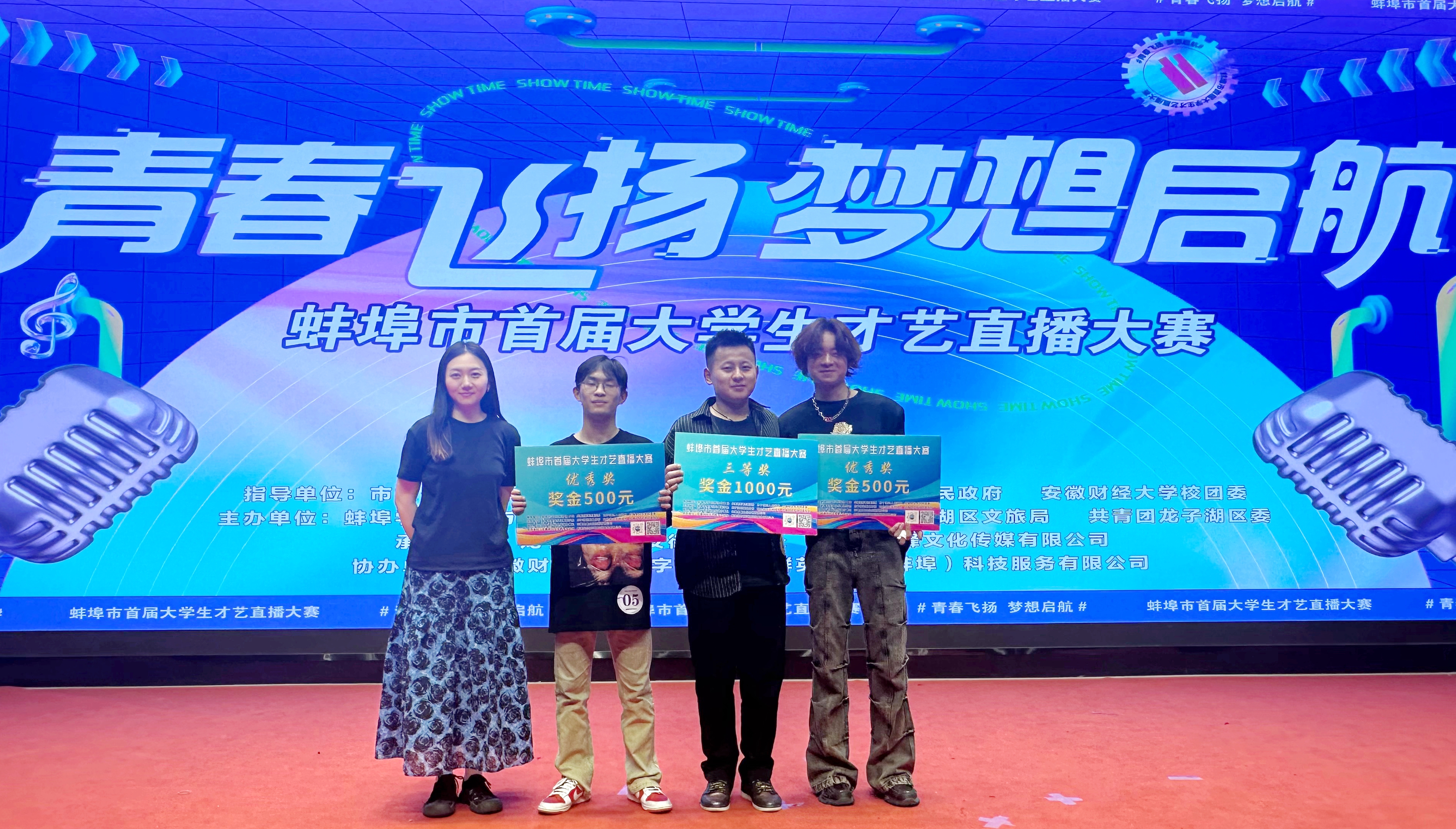 本网讯 近日,蚌埠市首届大学生才艺直播大赛在安徽财经大学数字经济产业园会展中心成功举办。软件工程学院李睿鹏在此次大赛中荣获三等奖,软件工程学院强勇、机电工程学院张宇坤、胡明驹分获优秀奖。