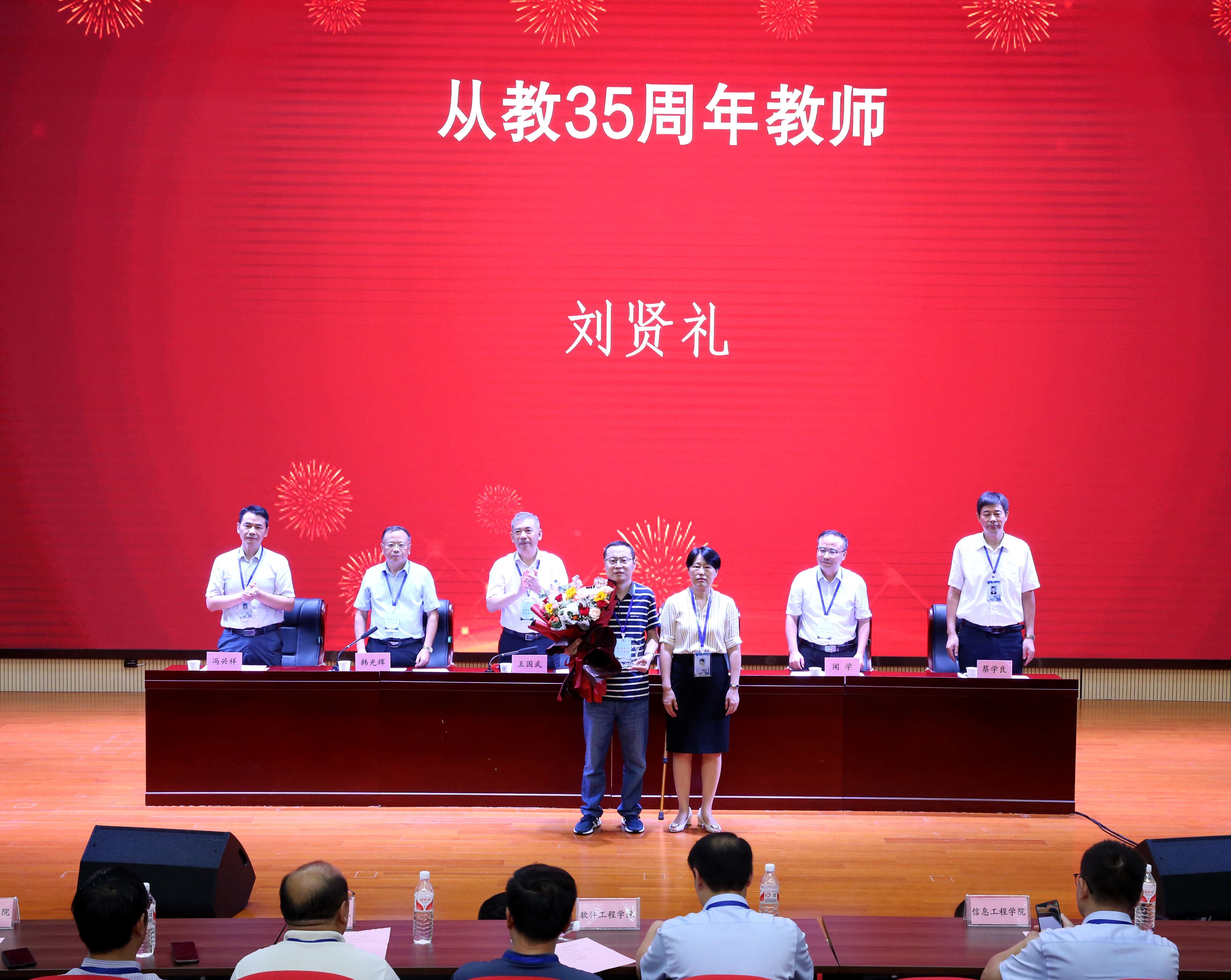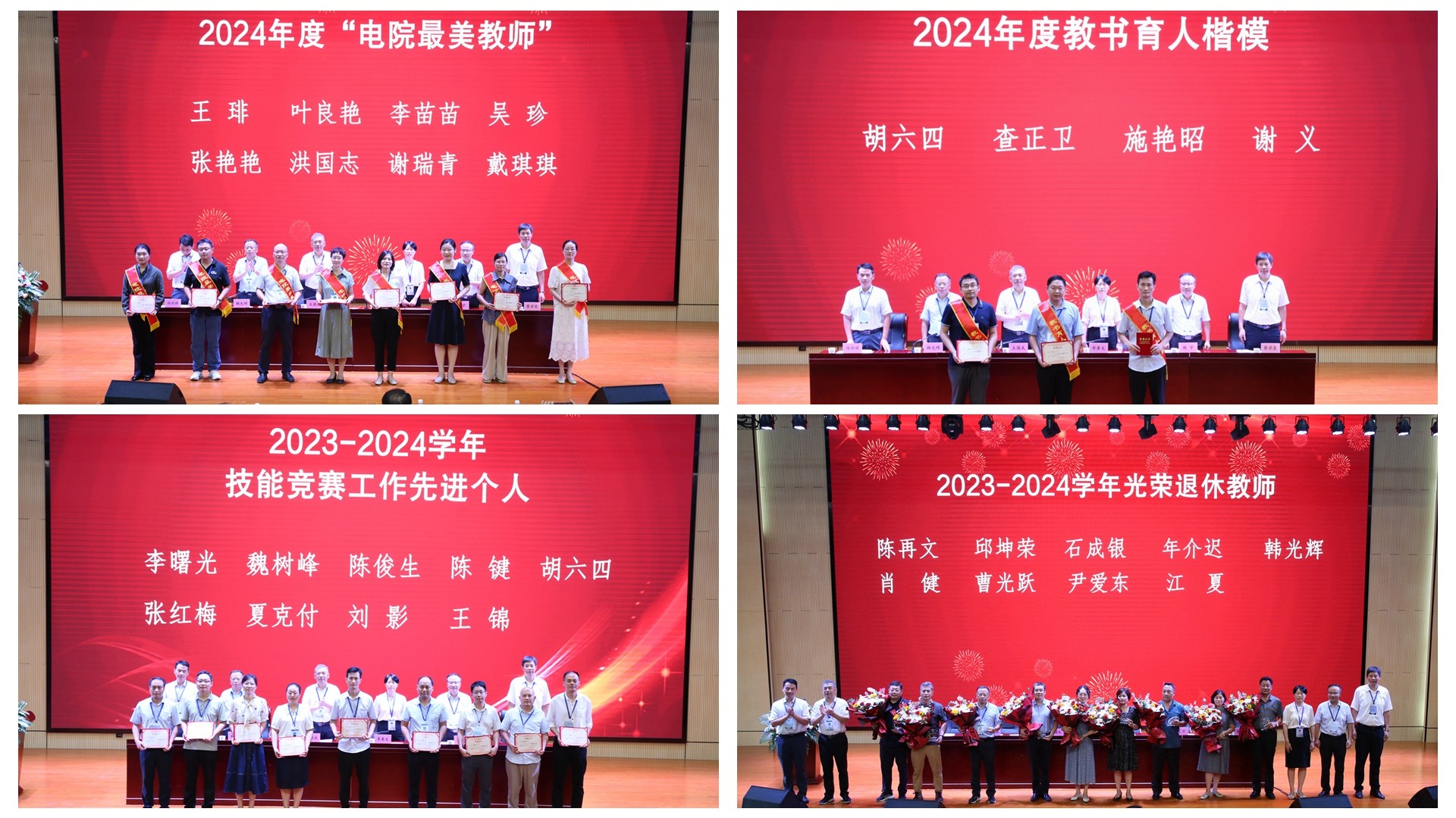 大会上,李素文宣读《关于表彰学院2024年度“电院最美教师”和教书育人楷模的决定》《关于表彰学院2023-2024学年技能竞赛工作先进个人的决定》,并带领学院全体教职工庄严宣誓。学院党政领导,先后为受表彰的“最美教师”“教书育人楷模”“技能竞赛工作先进个人”颁奖,为从教35周年的教师和2023—2024学年光荣退休教师颁发纪念牌和鲜花,优秀教师代表与新入职教师代表上台发言。