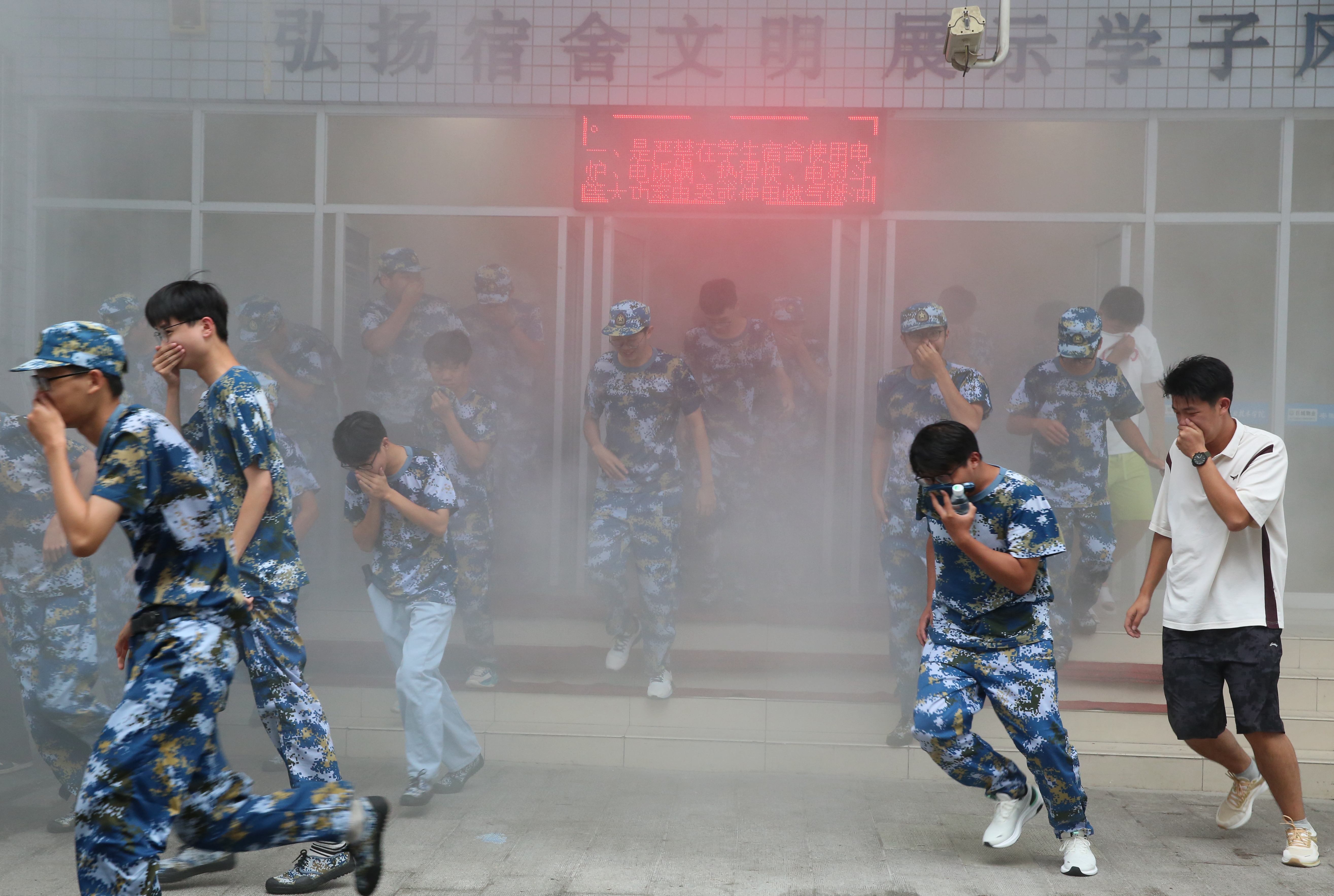 演练现场,各楼宇负责人、军训教官、辅导员、宿管员及安保人员提前到达指定岗位。随着警报声响起,在疏散引导员的指引下,同学们捂住口鼻,弯腰低身前行,快速、有序撤离到学院东操场的安全地带,各二级学院负责人在教官的帮助下清点人数,并向指挥长报告。3分20秒,4000余名师生全部安全疏散完毕,整个过程紧张有序、实用性强,收到了预期效果。