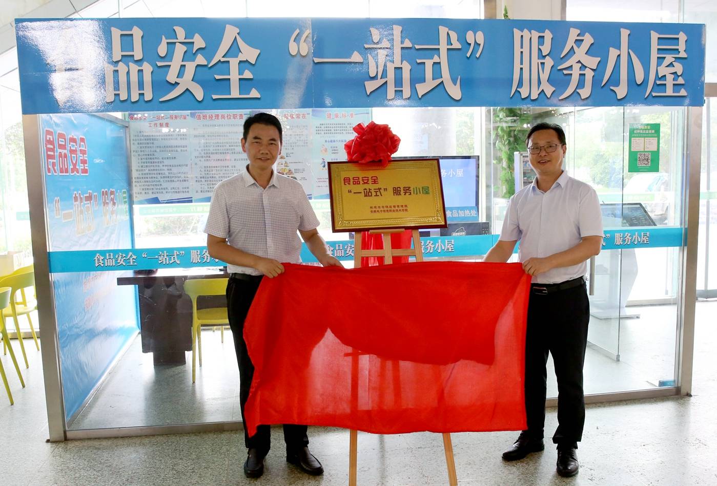 本网讯 9月13日上午,学院食品安全“一站式”服务小屋揭牌仪式在学院大学生生活服务中心成功举办。市食药安办副主任、市市场监管局副局长杨宝鼎,学院党委委员、副院长冯兴祥出席活动并讲话。市市场局相关科室负责人,兄弟高校代表,院学生处、总务处负责同志等出席活动,食堂托管企业负责人、师生代表和服务中心从业人员等160余人参加揭牌仪式。