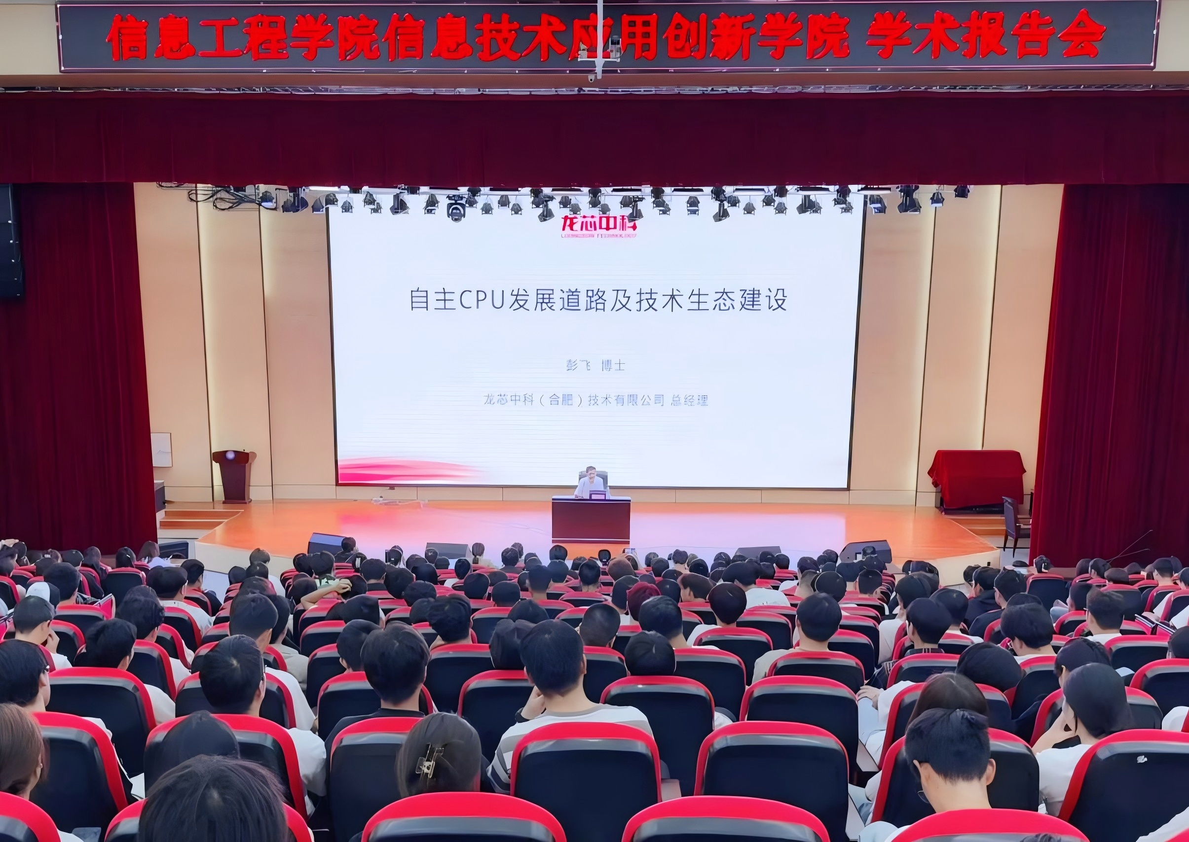 彭飞博士结合国产CPU的发展,以《自主CPU发展道路及产业生态建设》为题,从龙芯中科与安徽省的渊源、通用CPU芯片介绍、中国自主CPU发展道路、中国自主CPU生态体系建设等四个方面深入浅出地向与会师生介绍了国产CPU领域的辉煌成就与未来展望。报告会结束后,现场师生纷纷表示此次活动不仅加深了对中国自主CPU发展的认识和理解,也坚定了他们献身于科技强国建设的远大志向。