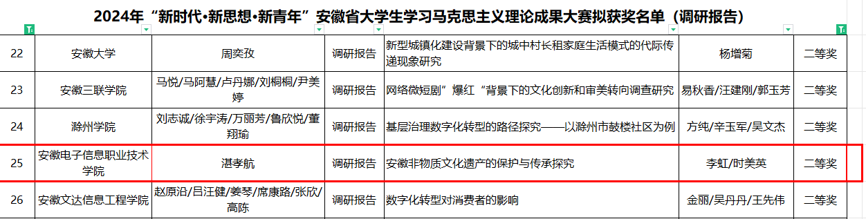 本网讯 近日,2024年“新时代•新思想•新青年”安徽省大学生学习马克思主义理论成果大赛评审结果公布。本次大赛,经过各高校组织初赛推荐,共有来自全省73所高校的的309项报送作品。我院选送的2件作品荣获二等奖。