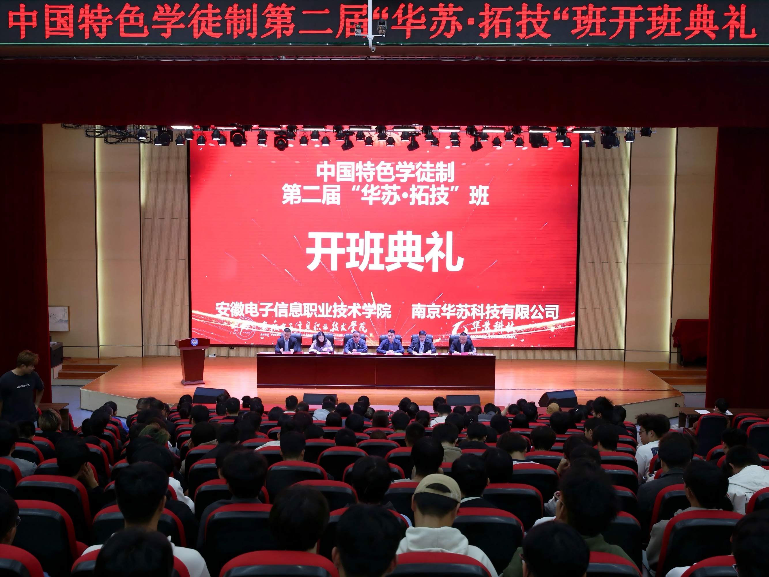 本网讯 10月30日下午,学院在实验楼学术报告厅举办中国特色现代学徒第二届“华苏·拓技”班开班典礼。学院党委委员、副院长闻学,党委委员、副院长冯兴祥,南京华苏科技有限公司副总经理李洪出席活动。南京华苏科技有限公司人才发展中心总经理高杨,教育事业部总经理赵雷雷,电子工程学院全体教职工,第一届和第二届“华苏·拓技”班全体学员参加活动,开班典礼由电子工程学院党总支书记、院长方庆山主持。