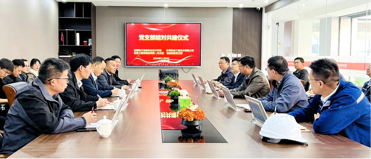 本网讯         为深入贯彻党的二十大和二十届二中、三中全会精神,落实立德树人根本任务,深度开展校企合作,加强产教融合,实现资源共享、优势互补、共同发展。11月6日,必赢766net手机版机电工程学院教师第一党支部与蚌埠凯盛工程技术有限公司智能制造党支部结对共建签约仪式在蚌埠凯盛工程技术有限公司举行。蚌埠凯盛工程技术有限公司党委副书记、总经理刘锐,党委委员、副总经理耿职,学院党委委员、组织人事处处长(统战部部长)聂小明,机电工程学院党政负责同志出席签约仪式,结对共建两支部党员和相关业务骨干参加活动。