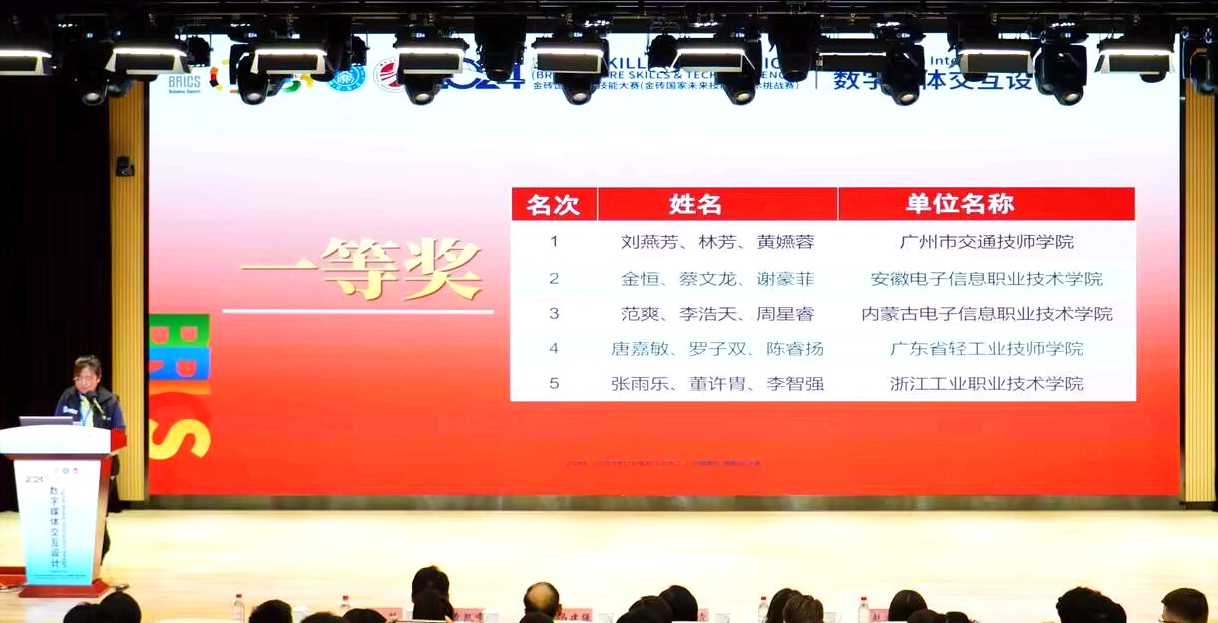 本网讯 近日,2024金砖国家职业技能大赛“数字媒体交互设计”赛项国际总决赛在广州交通技师学院正式落幕。我院计算机应用技术专业(Web前端开发)2023级学生金恒、蔡文龙、谢豪菲三人组成的团队以第二名的成绩斩获一等奖,程淑玉、李静两位老师获得“优秀指导专家”奖。
