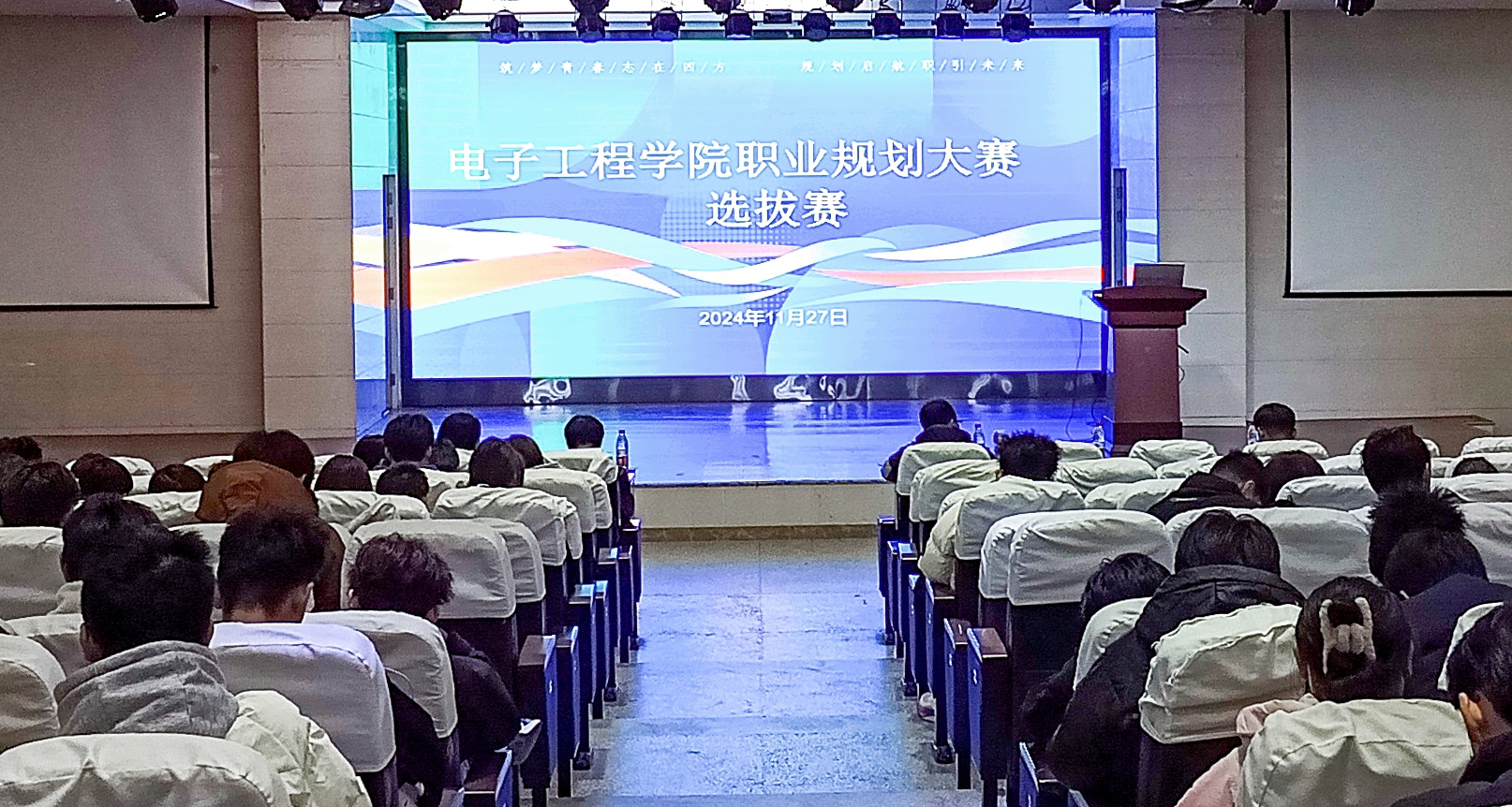 本网讯 为帮助大学生树立正确的成才观、就业观和择业观,提升职业生涯规划能力与就业竞争力,11 月 27 日下午,电子工程学院在信息中心学术报告厅成功举办2024年大学生职业规划大赛院级选拔赛。比赛评审工作组由机电工程学院、软件工程学院和电子工程学院教师代表组成,电子工程学院副书记俞慧慧出席比赛,专兼职辅导员、两百余名学生代表观摩比赛。
