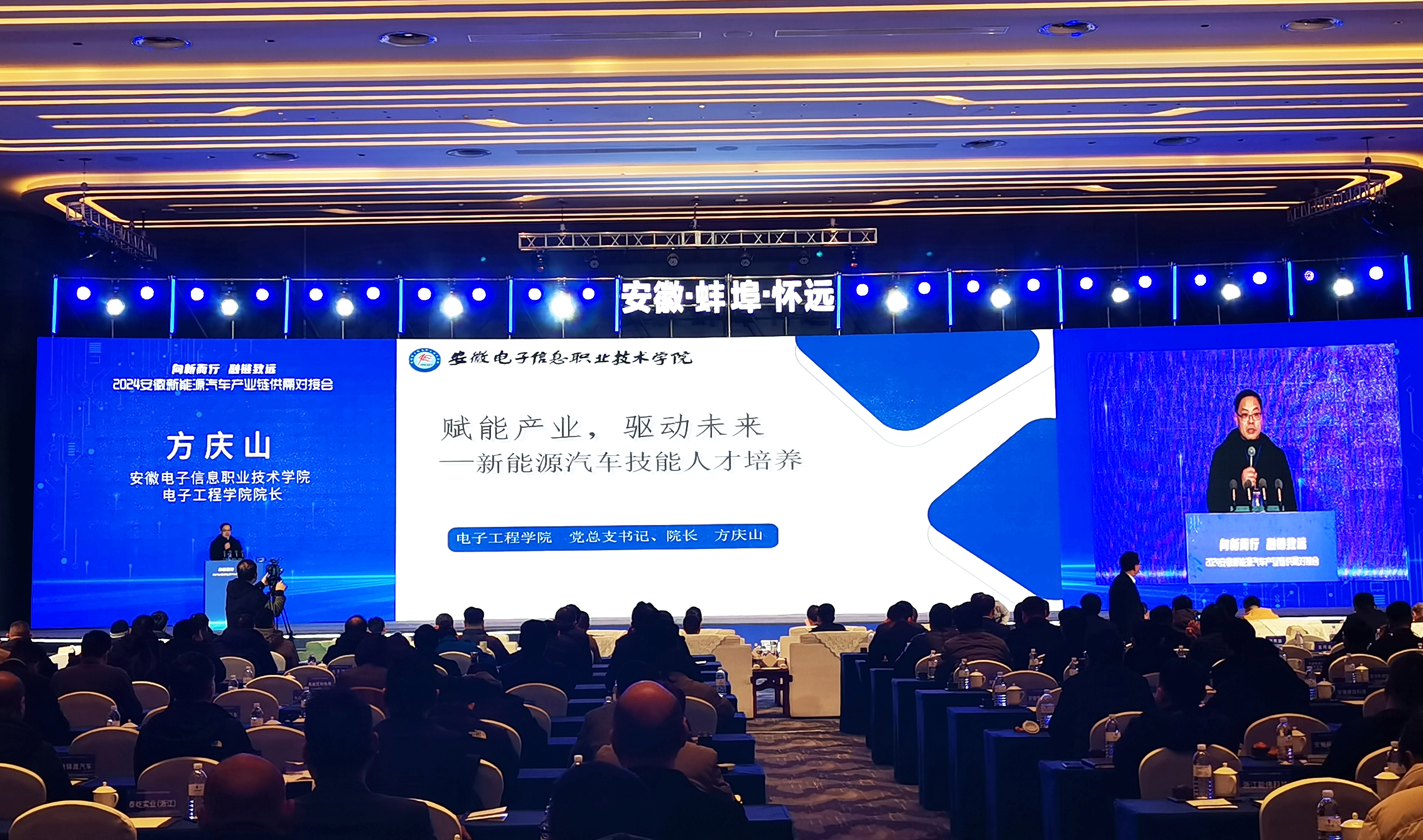 本网讯 12月13日上午, 2024年安徽省新能源汽车产业链供需对接会在蚌埠市怀远县隆重举行。本次会议围绕“向新而行·融链致远”主题,省内外10家整车制造企业,200余家汽车零部件企业,多所高校、科研院所和金融机构汇聚一堂,旨在共同推动新能源汽车产业的深度融合发展。电子工程学院院长方庆山受邀作“赋能产业,驱动未来 新能源汽车技能人才培养”的主题推介发言。