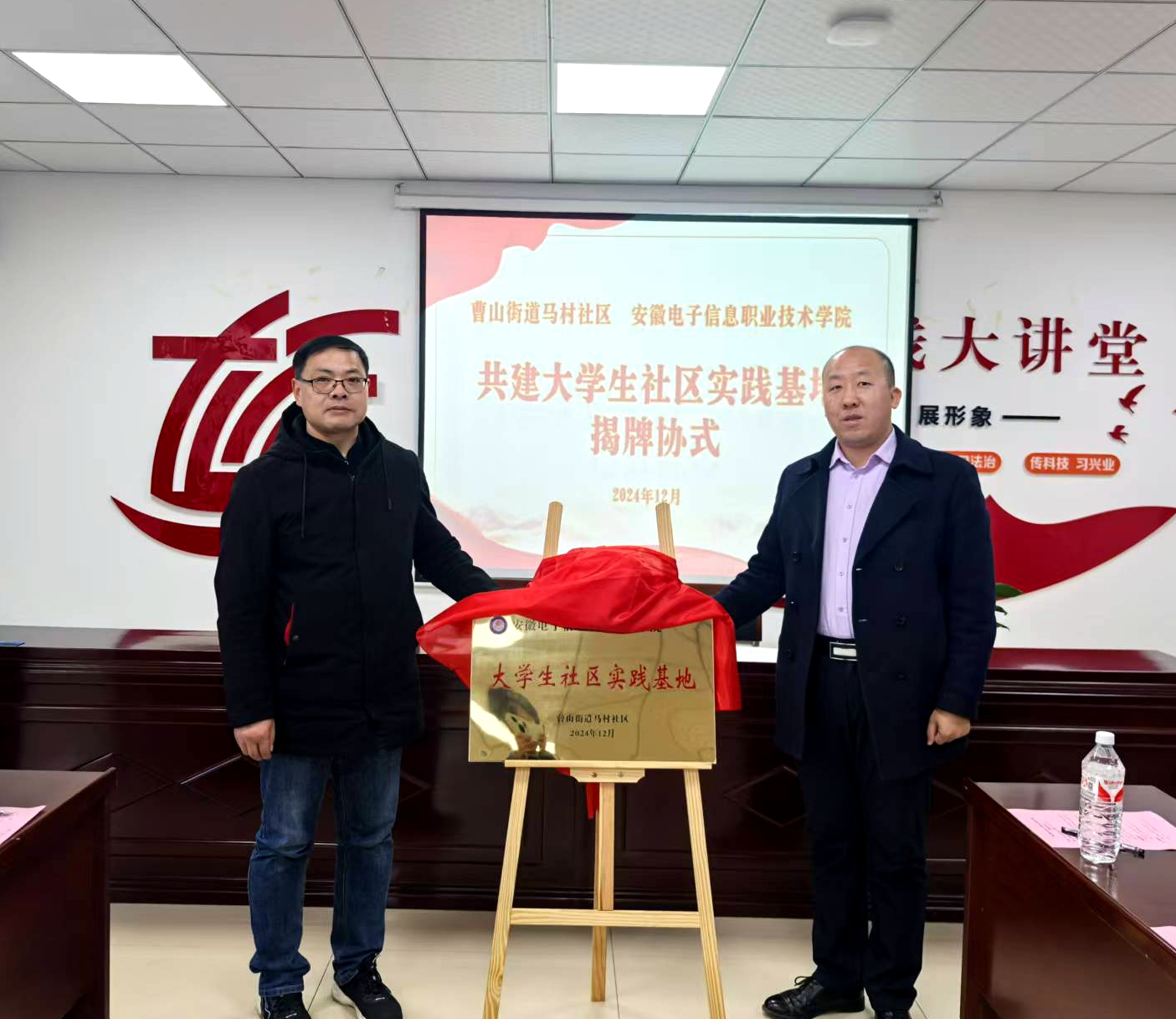 座谈会上,曹山街道办公室主任张效永对方庆山一行的来访表示热烈欢迎,他介绍了此次活动的背景、马村社区的基本情况。张效永表示,希望双方能够以此活动为契机,进一步深化合作,为社区发展贡献高校力量。方庆山在致辞中向张效永及马村社区表达了感谢,并详细介绍了电子工程学院的专业建设、师资力量、人才培养等方面情况。方庆山表示,本次共建合作,既是为大学生参与社会实践和志愿服务创造了一个平台,使他们有机会深入社区,增强解决实际问题的能力;又是推动双方支部党建工作再上新台阶。他希望后续双方在社区实践、志愿服务、科普宣传等方面开展深入交流合作。会后张效永和方庆山共同签署了共建合作协议,并为大学生社区实践基地揭牌。