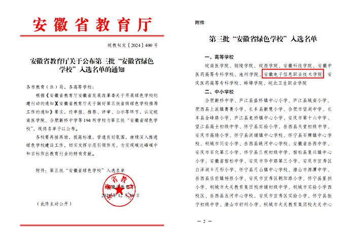 本网讯 近日,安徽省教育厅公布了第三批“安徽省绿色学校”名单,学院获评“安徽省绿色学校”。
