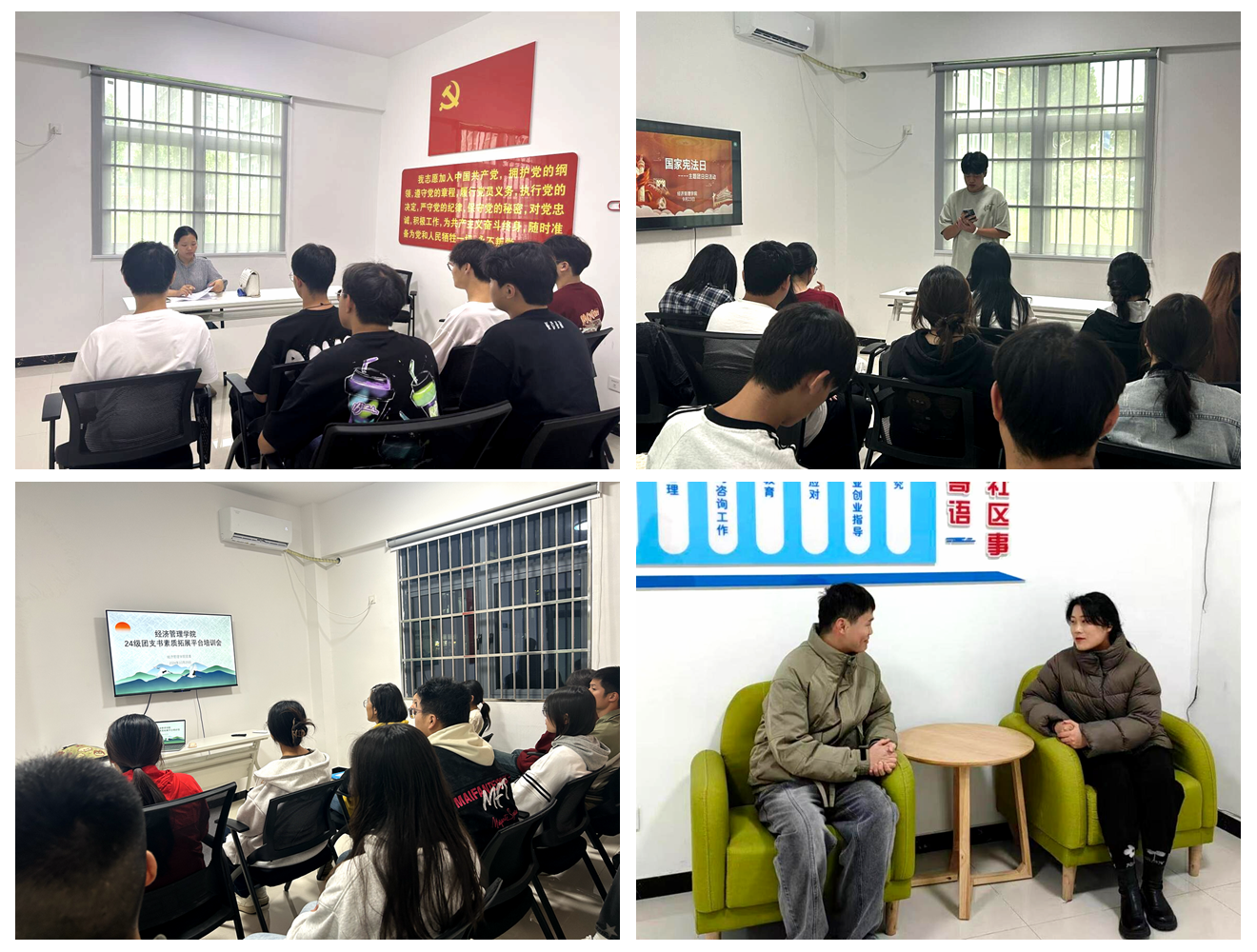 搭建学生活动“服务站”,在“一站式”学生社区中,党建活动室、朋辈工作室等活动室一应俱全。依托学生社区,经济管理学院先后举办“推优”工作培训会、《习近平与大学生朋友们》读书分享会、国家宪法日团日活动、团支书素质拓展平台培训会等活动。目前,“一站式”学生社区已逐渐成为经济管理学院学生思想政治教育的新“基地”和教育实践“大课堂”。