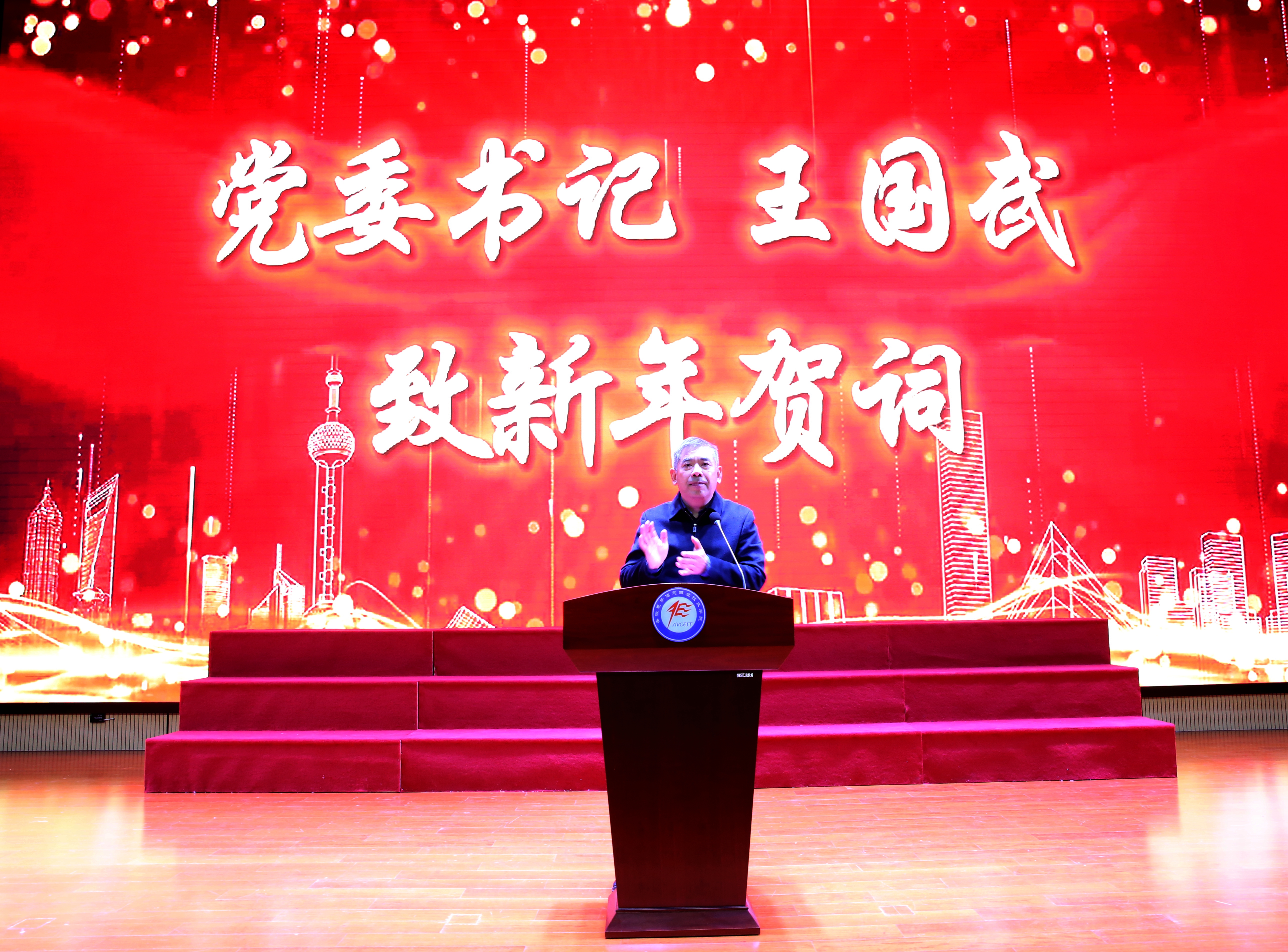 王国武致新年贺词,他代表学院党政领导班子,向一年来情系学院发展、支持学院建设的各级领导、企业家代表、离退休老同志和社会各界人士表示衷心的感谢,向默默奉献、辛勤耕耘的全体教职工,向勤奋求学、勇敢追梦的同学们,致以最诚挚的节日问候和最美好的新年祝福!他指出,2024年是中华人民共和国成立75周年,是实现“十四五”规划目标任务的关键一年,也是学院高质量内涵式发展的一年。