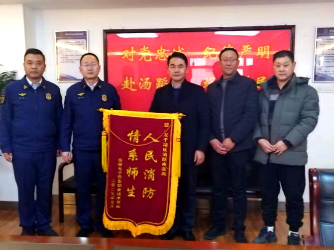 在龙子湖区消防救援大队,冯兴祥衷心感谢龙子湖区消防救援大队一直以来在消防安全教育和管理等方面给予的大力支持与帮助,并赠送“人民消防、情系师生”锦旗,期望进一步加强合作,推动军民融合。大队长张宪伟代表全体消防官兵感谢学院的慰问,表示将以更加扎实的工作作风,更加有力的举措,推动学院消防建设取得新发展、实现新跨越。