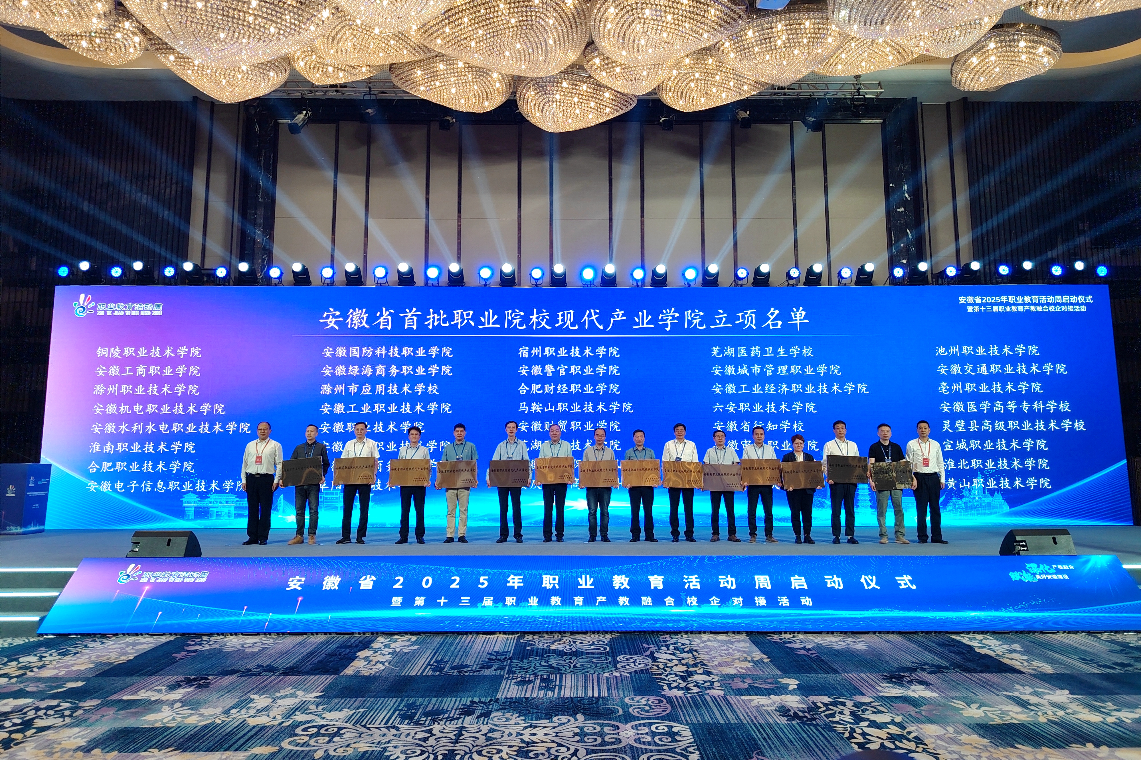 会上,宣传推介了2024年度全省职业教育工作优秀典型。在安徽省首批职业院校现代产业学院,安徽省技能特色高校建设(培育)单位,安徽省第二批行业产教融合共同体培育项目等3个方面,学院被作为典型宣传推介。学院智能制造产业学院作为安徽省首批职业院校现代产业学院参加了授牌仪式。