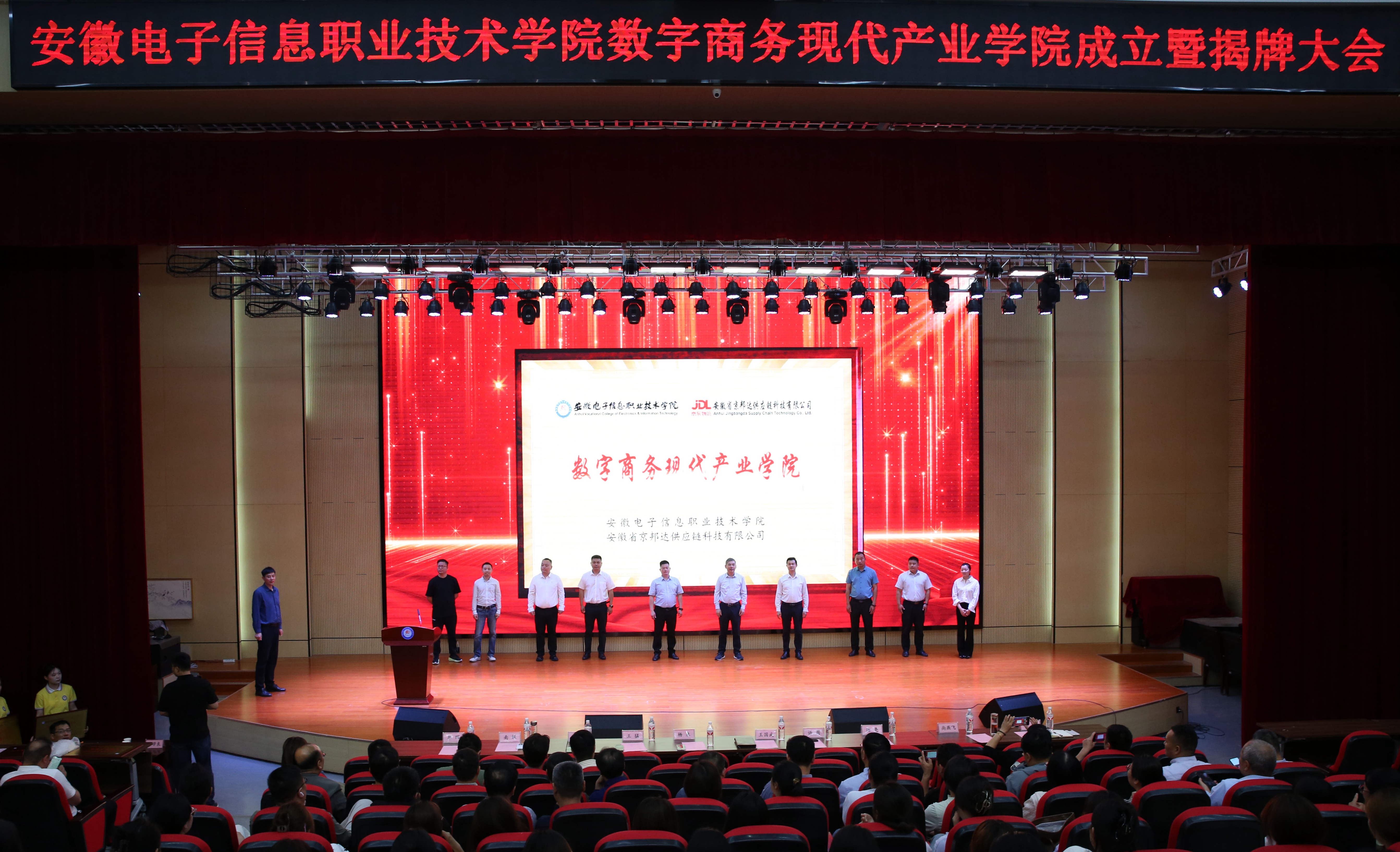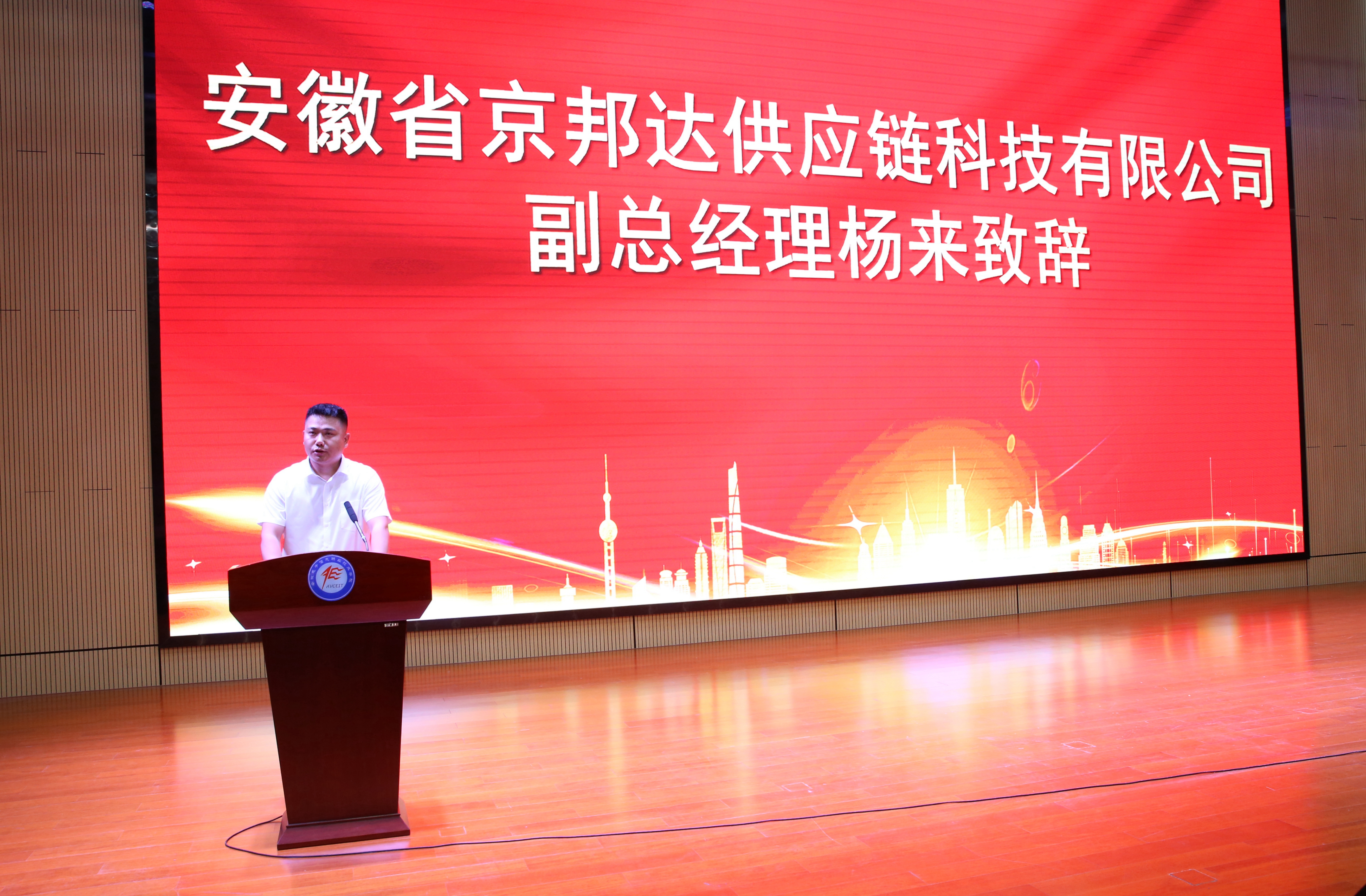 王国武代表学院致欢迎词。他指出,数字商务现代产业学院的成立是学院适应数字经济时代发展需求、深化教育教学改革的重要举措。学院将以此为契机,紧密依托省级“双高校”“双特色校”项目,充分发挥自身的专业优势和教育资源,深度联合京东集团子公司—安徽省京邦达供应链科技有限公司、安徽汇旺餐饮管理有限公司(甜啦啦)、百胜餐饮(安徽)有限公司、安徽邻几便利店有限公司等多家行业龙头企业,共同探索数字商务人才培养的新模式、新路径,为地方经济发展和产业升级提供有力的人才支撑。同时,学院也将借助数字商务现代产业学院的平台,加强与企业在联合培养、科研创新、社会服务等方面的合作,努力建成一个集人才培养、技术创新、企业服务、学生创新创业等功能于一体的示范性现代产业学院,将数字商务现代产业学院打造成数字商务人才的培养高地。