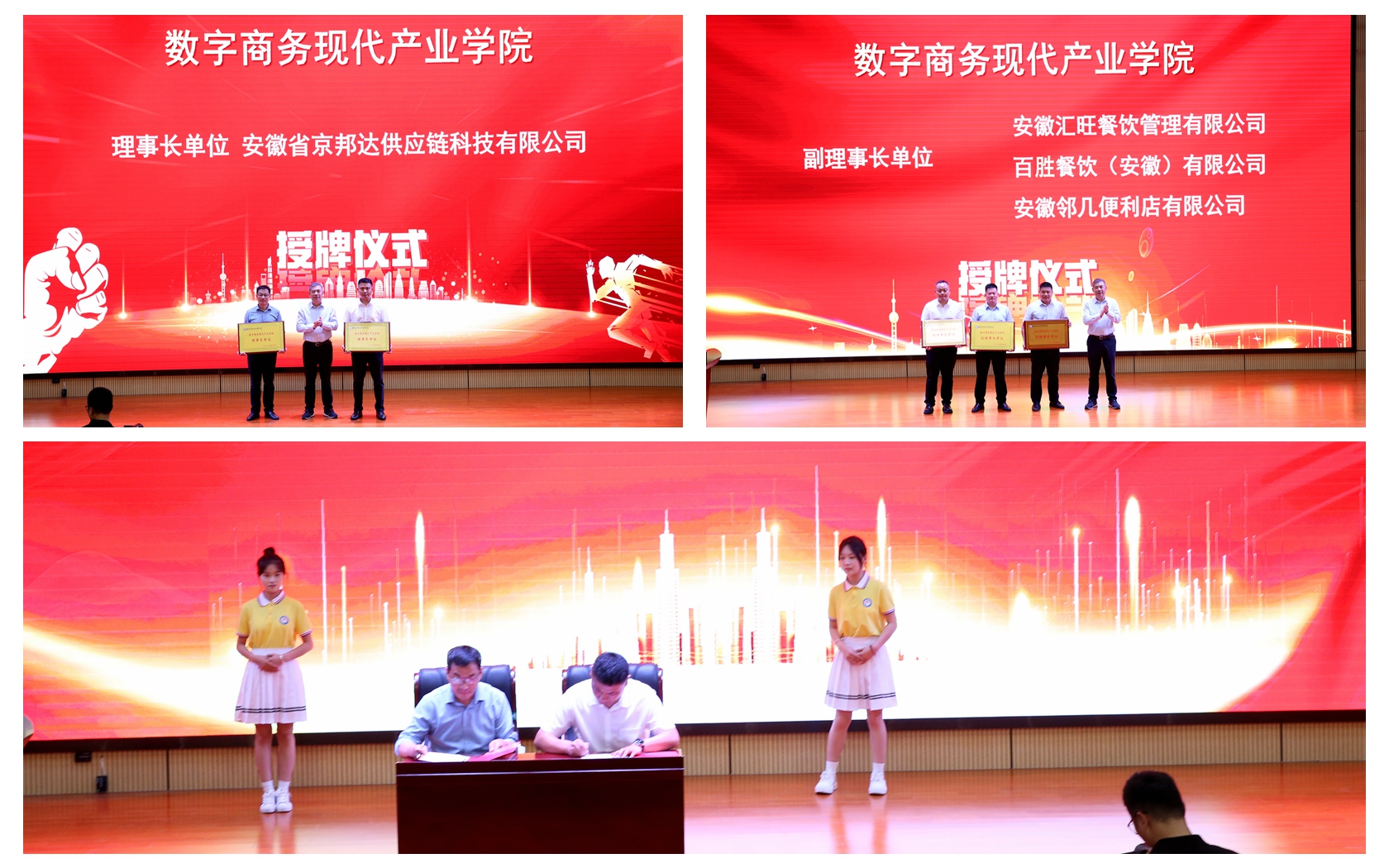 仪式现场,王国武与企业家们共同为数字商务现代产业学院揭牌,现场掌声雷动,气氛热烈。随后,王国武为理事长单位和副理事长单位授牌。学院与安徽省京邦达供应链科技有限公司举行了合作签约仪式,就人才培养、实践教学、实习就业等方面达成了具体合作意向。