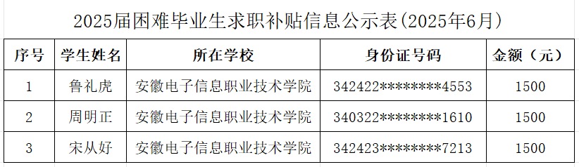 为贯彻落实《关于做好2025届困难毕业生求职补贴信息化发放工作的通知》(皖人社明电〔2024〕78号)文件精神,学院2025届困难毕业生求职补贴第六批共审核通过3人。现将通过人员名单公示如下,公示时间2025年7月2日-7月8日。如有异议请电话联系:0552-3172929,监察审计处:0552-3172884。