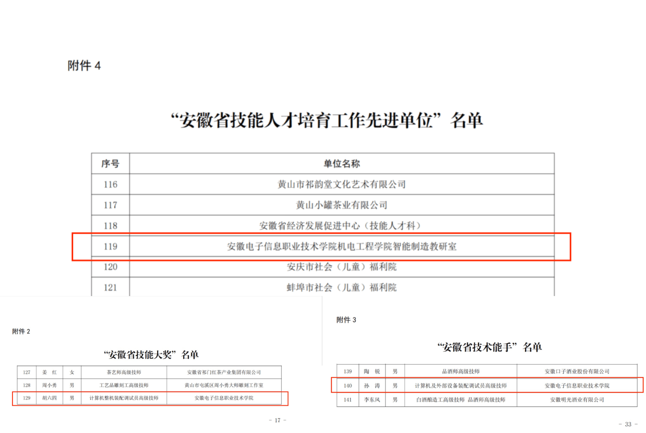 本网讯 近日,安徽省人力资源和社会保障厅正式公布《关于表彰第十五届全省高技能人才的决定》(皖人社发〔2026〕1号),学院在本次评选中表现突出,斩获多项殊荣。其中,机电工程学院智能制造教研室获评“安徽省技能人才培育工作先进单位”,软件工程学院胡六四老师荣获“安徽省技能大奖”,软件工程学院孙涛老师获评“安徽省技术能手”。
