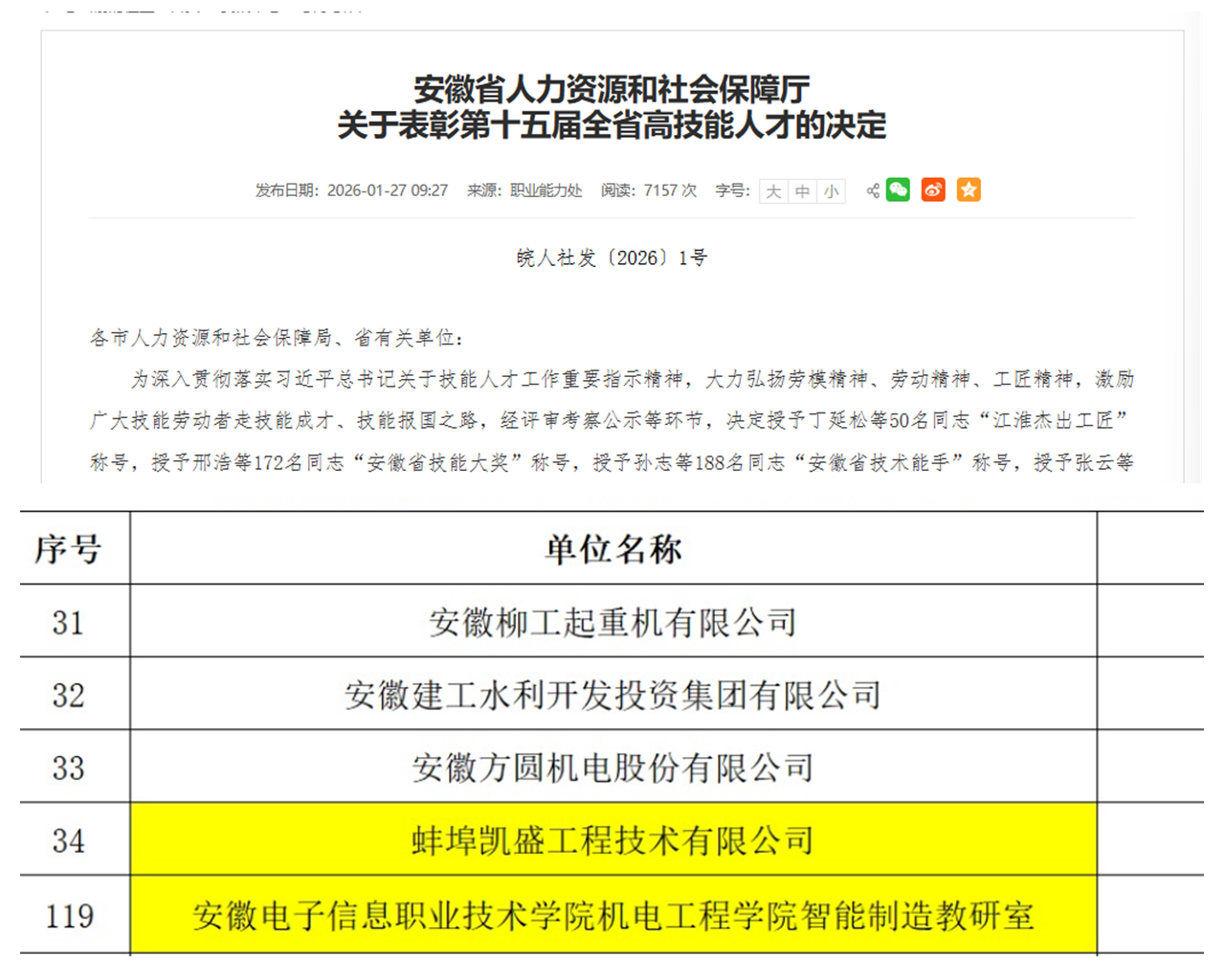 本网讯 近日,安徽省人力资源和社会保障厅公布了第十五届安徽省高技能人才表彰名单,必赢766net手机版机电工程学院智能制造教研室与智能制造产业学院龙头企业蚌埠凯盛工程技术有限公司双双荣获 “安徽省技能人才培育工作先进单位”称号。这一荣誉的获得,是对双方长期深耕产教融合、协同培养高技能人才的高度肯定,也是校企双方在服务地方产业发展中取得的重要阶段性成果。